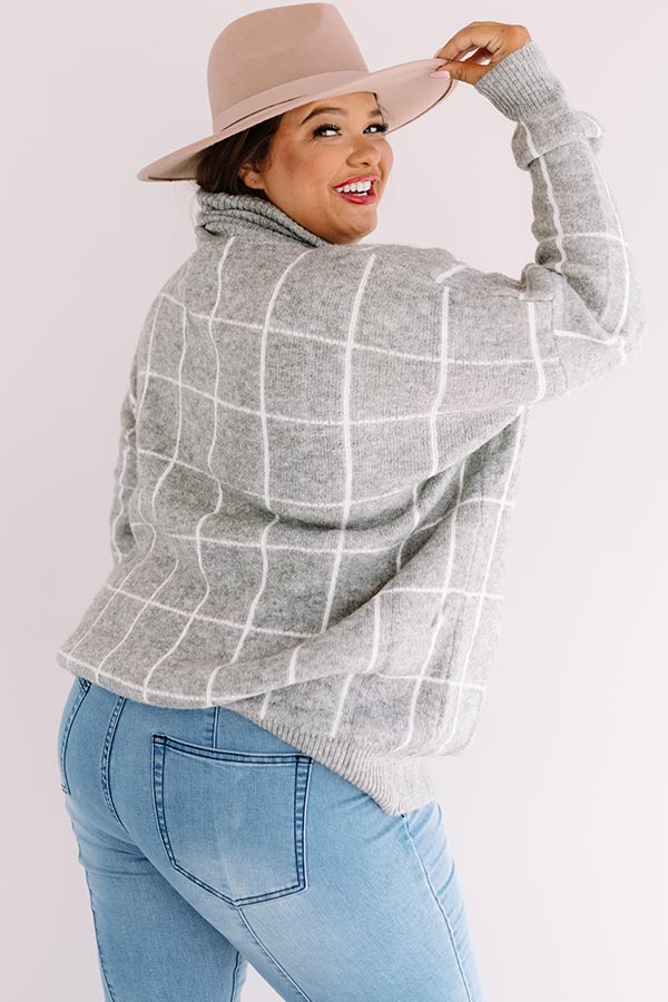 Plus Size - We have no doubt you will love this grey sweater "a latte" with its soft lightweight tight knit material patterned with a large white checkered pattern. an oversized turtle neckline. long loose sleeves with fitted cuffs that can be rolled. ribbed trim detailing. and a relaxed silhouette that falls into a straight hemline!