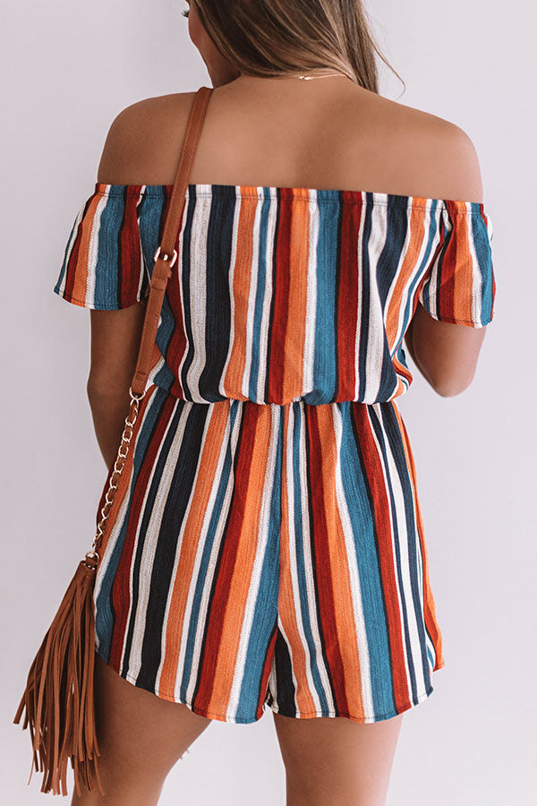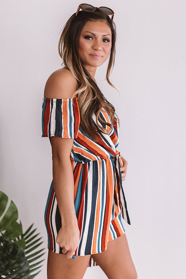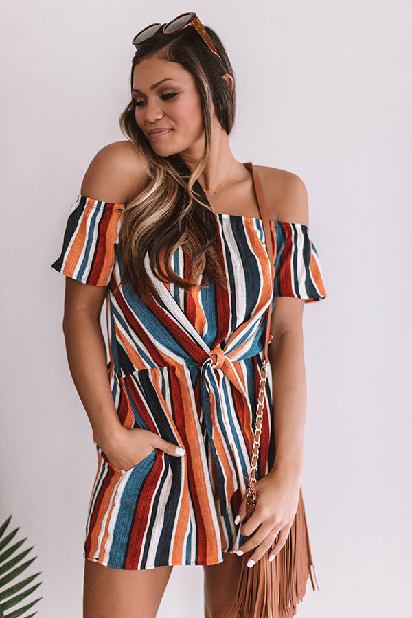 Create a night to remember in an outfit they will never forget! The "A Night To Remember Stripe Romper" has an elasticized off-the-shoulder neckline. short sleeves. a trendy tie-front upper bodice that rests above a cinched elastic waist & a breezy polyester short with side pockets. Complete your look with wedges & a fun statement earring! - Hand wash cold. Line dry. - Unlined. but not see through.