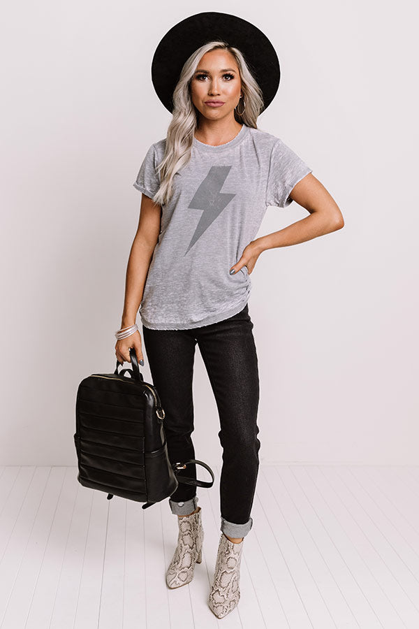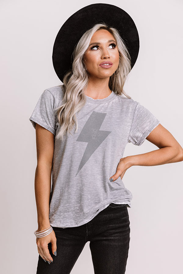 Designed to feel like the perfect vintage tee. this light grey cutie features soft lightweight slightly sheer cotton material. an AC/DC original graphic and logo on the front and back. subtly distressed trim detailing. a high rounded neckline. short loose sleeves. and a flattering slimmer fit silhouette that falls into a straight hemline!