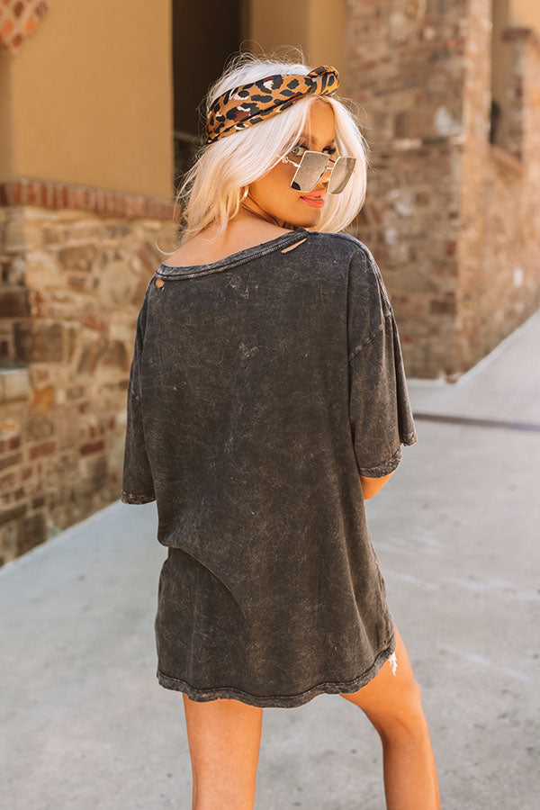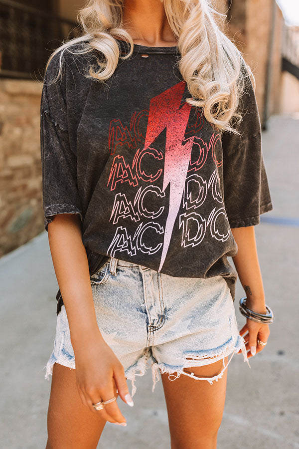 Our vintage black 'AC/DC Lightning Bolt' tee features soft lightweight material with distressed detailing. a red lightning bolt graphic on the front. a rounded neckline. short loose sleeves. and a slouched silhouette that ends in a straight hemline!
