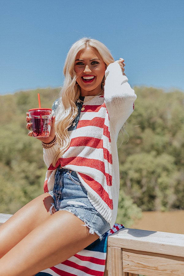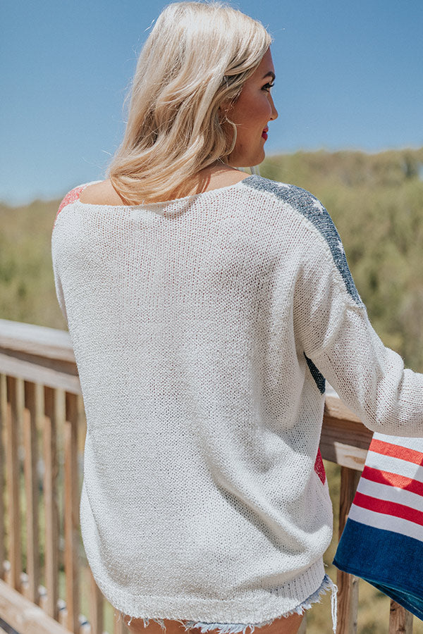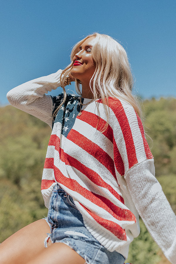 Transition into those warmer months effortlessly with our festive 'Across The USA' sweater featuring lightweight knit material patterned with a red. white. and navy American flag. a scooped neckline that can be worn off one shoulder. long loose sleeves. and a slouched silhouette that falls into a straight ribbed hemline!