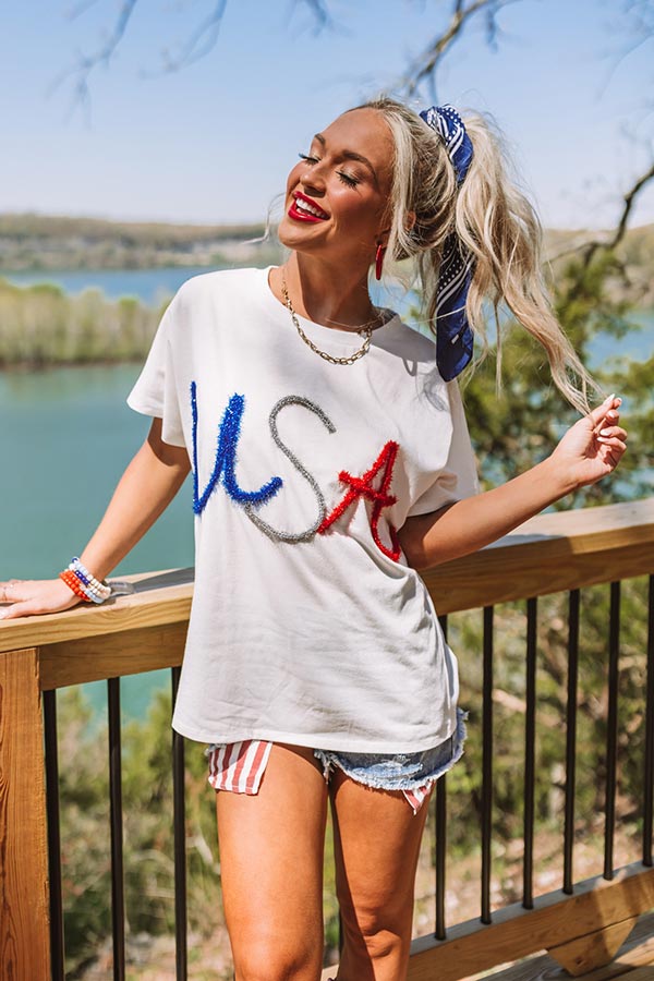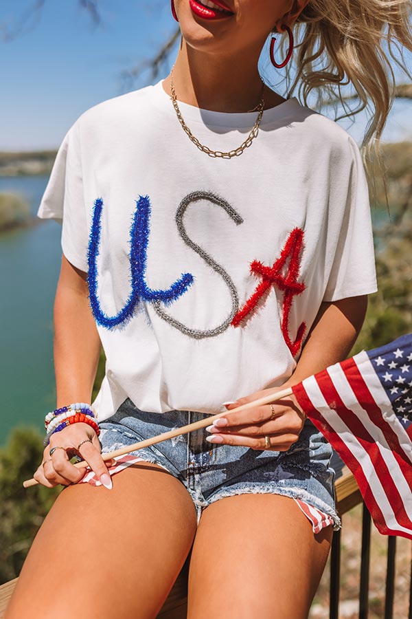 - Simple yet stylish. this trendy tee is perfect for showing your national pride! - Lightweight material - A colorful tinsel USA design - A round neckline - Short. loose sleeves - A relaxed silhouette that ends in a straight hemline