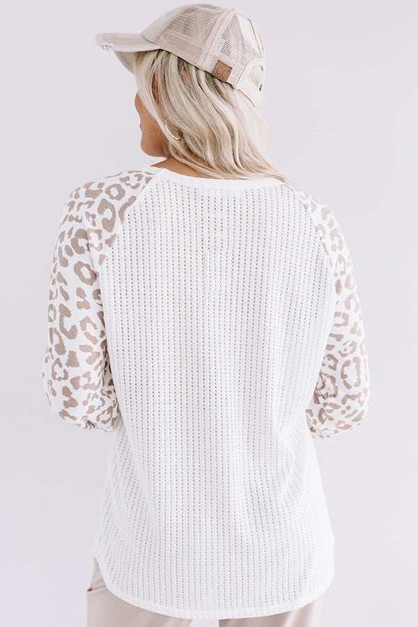 Don't hesitate to add our darling "Added Kindness" top to your cart with its soft lightweight tight knit material. white bodice with perforated detailing. v-cut neckline. long bold leopard print on the long loose bubble sleeves with fitted cuffs. and relaxed silhouette that falls into a rounded hemline! We have styled this adorable piece with some neutral joggers. a matching baseball cap. and a trendy sneaker and faux leather tote. but you can also wear with some distressed denim shorts and the "Steve Madden Mckenzie Wedge in Tan!"