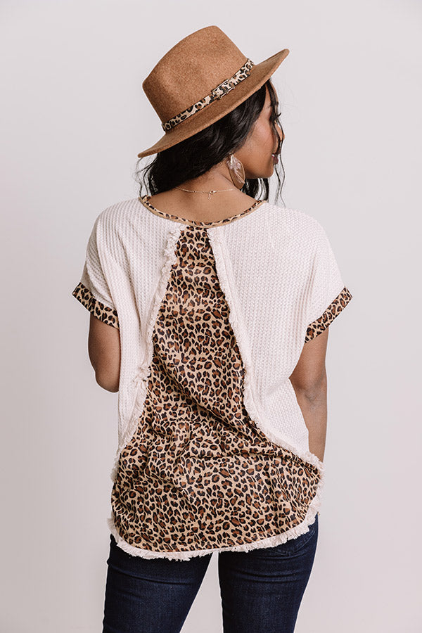 Slay all day in our charming neutral "Adorable Dreams" shift top featuring soft lightweight material with waffle knit texturing. bold black and brown leopard print along the trim and down the back. a scooped neckline. short sleeves. fringed seam detailing. and a flattering silhouette that falls into a rounded hemline!