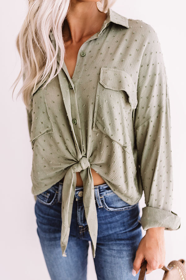 When "adventure is calling" throw on this sage top featuring a button down bodice with a collared v-neckline. long roll-tab sleeves that can also be worn down. two accent pockets. a subtle polka dot texture. and a relaxed bodice with a tied hemline in the front and a rounded hemline in the back! We have styled this piece for the fall with some distressed skinnies. leopard booties. and a neutral backpack. but you can wear it during the summer with our "Parker High Waist Distressed Shorts in White." an ivory headband. and "The Marlow Espadrille in Sage!"