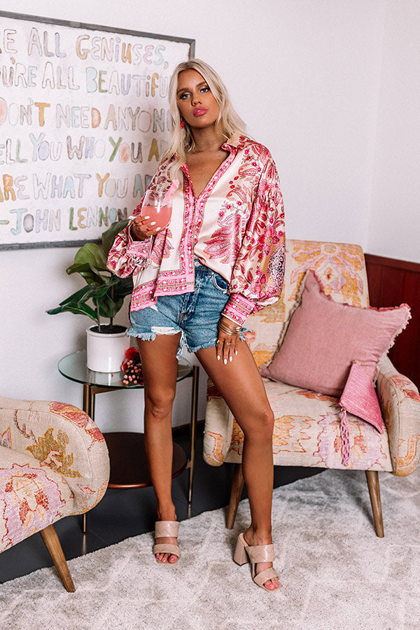 Add a fun addition to your wardrobe with our pretty pink 'Affectionate Feeling' top featuring lightweight satin material patterned with an intricate floral print. a button down front with a collared v-cut neckline. long loose sleeves with button closure cuffs. and a relaxed silhouette that falls into a rounded hemline!