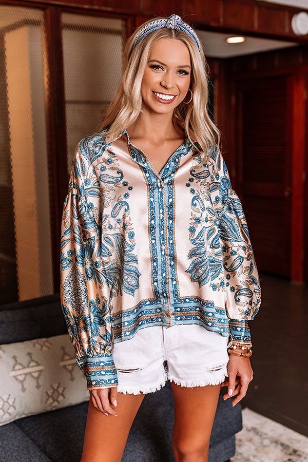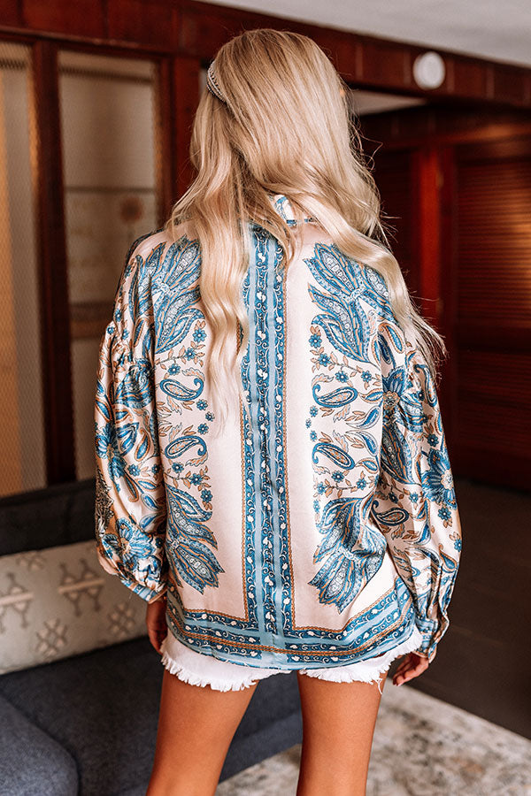 Add a fun addition to your wardrobe with our pretty sky blue 'Affectionate Feeling' top featuring lightweight satin material patterned with an intricate floral print. a button down front with a collared v-cut neckline. long loose sleeves with button closure cuffs. and a relaxed silhouette that falls into a rounded hemline!