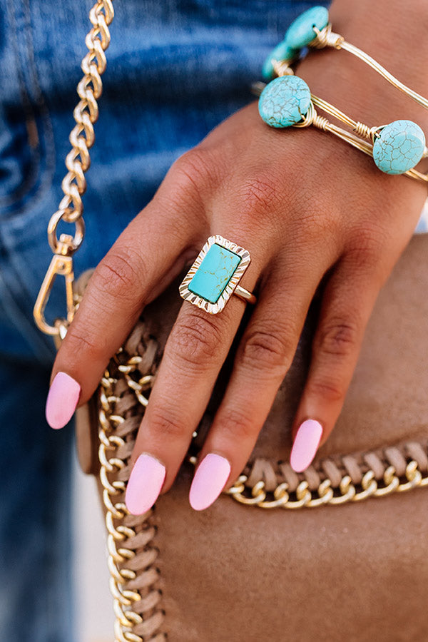 There is no better piece of jewelry to throw on for an after work social than this stunning ring featuring a rectangle turquoise stone in a vintage gold setting!