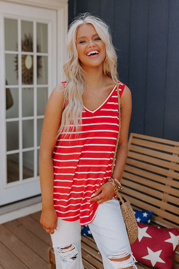 Keep your look simple but stylish in our casual red 'Afternoon Sail' tank featuring soft lightweight material patterned with horizontal white accent stripes. a v-cut neckline with wide sleeveless shoulder straps. and a relaxed silhouette that falls into a rounded hemline! on products