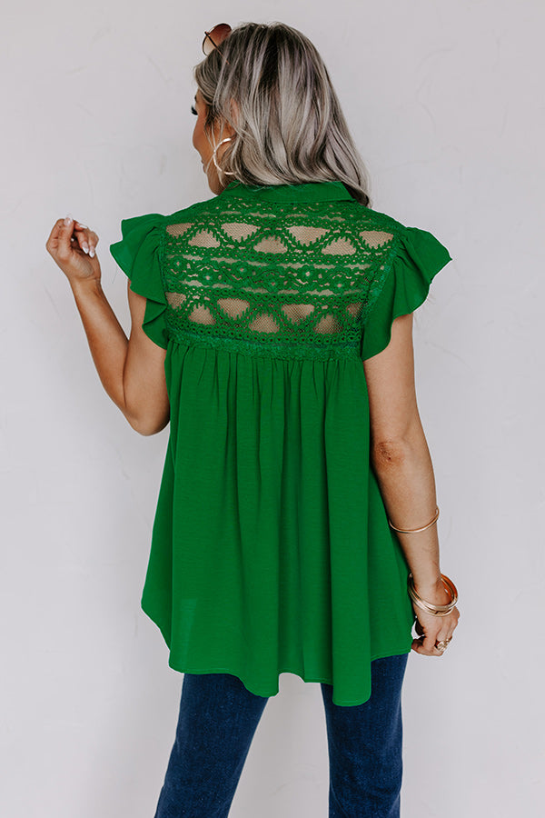 – Feel the breeze in our new beautiful top – Lightweight gorgeous green material with an accent lace design – Button up. round neckline – Short ruffle sleeves – Flattering silhouette that falls into a straight hemline
