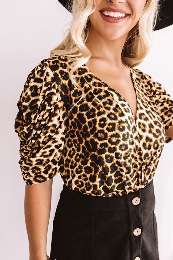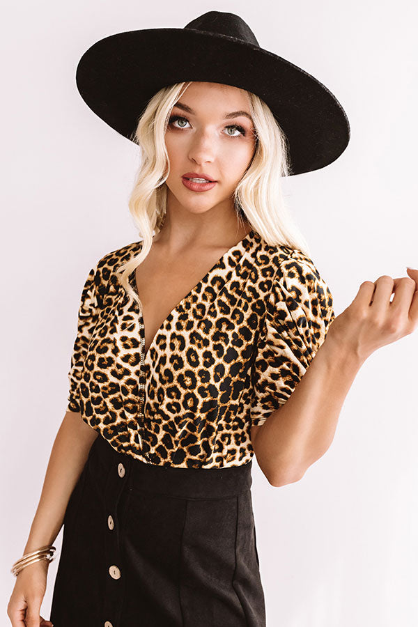 You will be "aiming to please" in this bold bodysuit featuring a fierce leopard print. stretchy material. bunched half sleeves with puffed shoulder detailing. a deep v-cut neckline. and a cheeky bottom fit with a double snap closure! Style this flirty piece with a great pair of high waisted skinny jeans. a mini skirt or your favorite pair of leather leggings. for a Glamorous layered look in minutes!