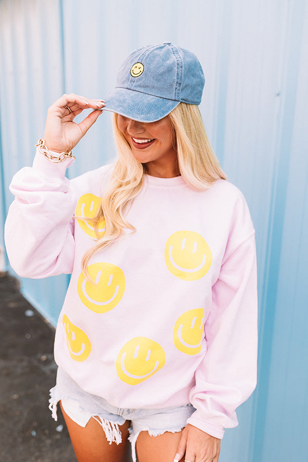 We have no doubt you will be all smiles when you cozy up in this adorable light pink sweatshirt featuring soft lightweight material patterned with large yellow smiley faces. a rounded neckline. long loose sleeves with fitted cuffs. and a slouched silhouette that ends in a straight hemline!