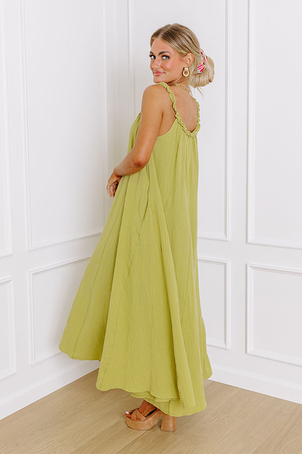 - Feel the summer breeze in this flowy maxi! This enchanting piece effortlessly blends sophistication with a touch of whimsy. making it the perfect choice for any occasion where you want to make a stylish statement. Whether you are attending a garden party or a seaside soirée. this maxi dress is your ticket to timeless beauty and undeniable charm. - Unlined subtly textured material - A scoop neckline with a ruffled texture - Ruffled spaghetti straps - A sleeveless cut - Functional side pockets - A relaxed silhouette that ends in a maxi length hemline