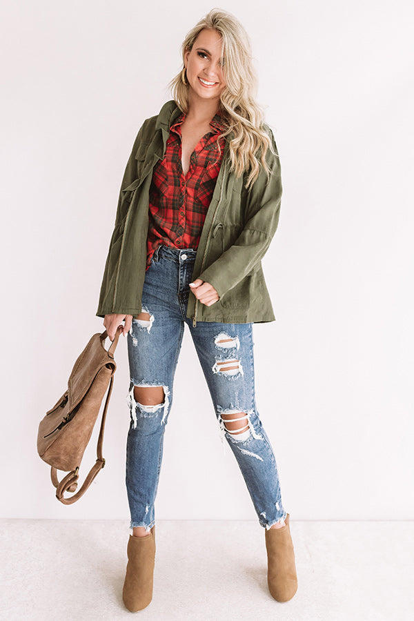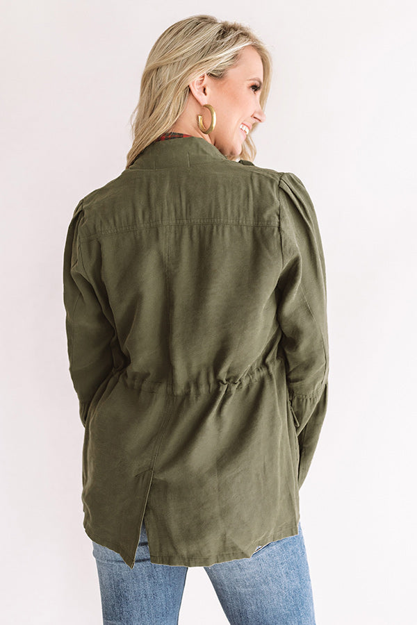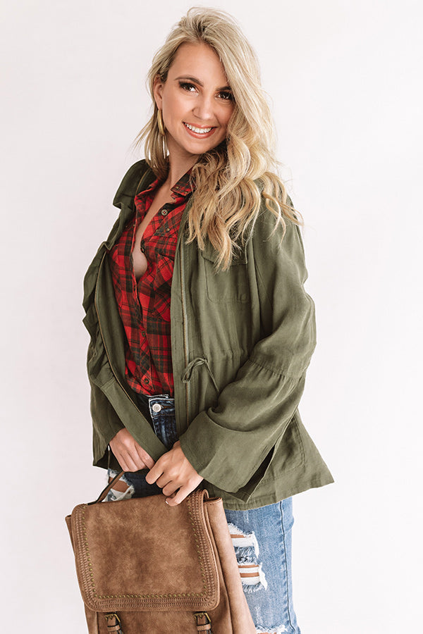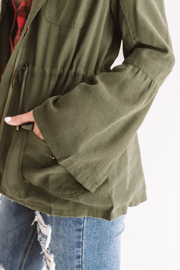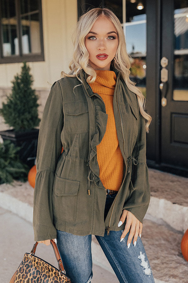 The green hued "All Who Wander" jacket is sure to keep you warm during those chilly fall days with its lightweight fit. long sleeves with slit cuffs that flare at the elbow. four flap accent pockets with snap closure. cinched waistband with a tie belt. straight hemline with a back center notch. and ruffled zip up front silhouette!