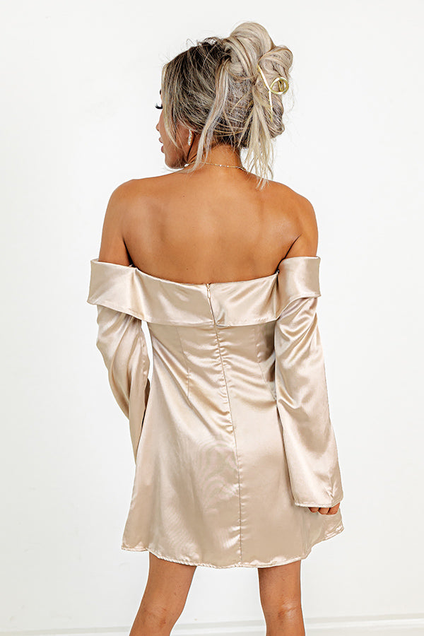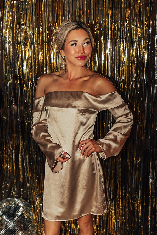 - You will be feeling flirty in this chic dress! - Fully lined material with a satin finish - A fold-over off-shoulder neckline with an interior non-slip strip - Long sleeves - Back zip closure - A figure hugging silhouette that ends in a mini dress length hemline