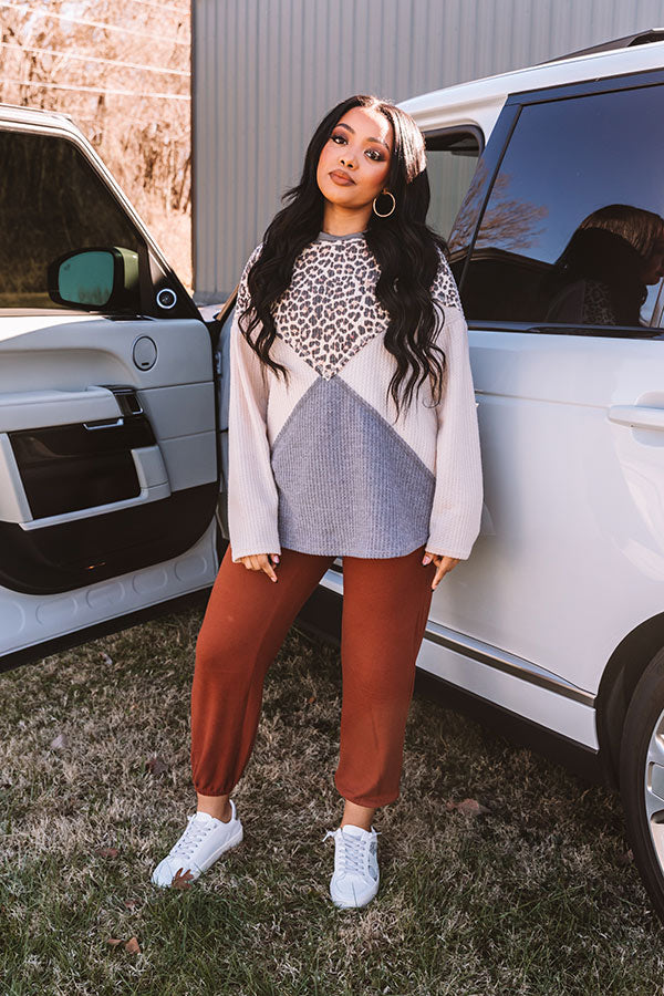 We have no doubt you are already infatuated with this unique top. so why not add it to your cart?! It features lightweight flowy material with a bold leopard print bodice and shoulders. long light neutral hued sleeves. a high rounded neckline. and a relaxed grey silhouette that falls into a straight hemline!