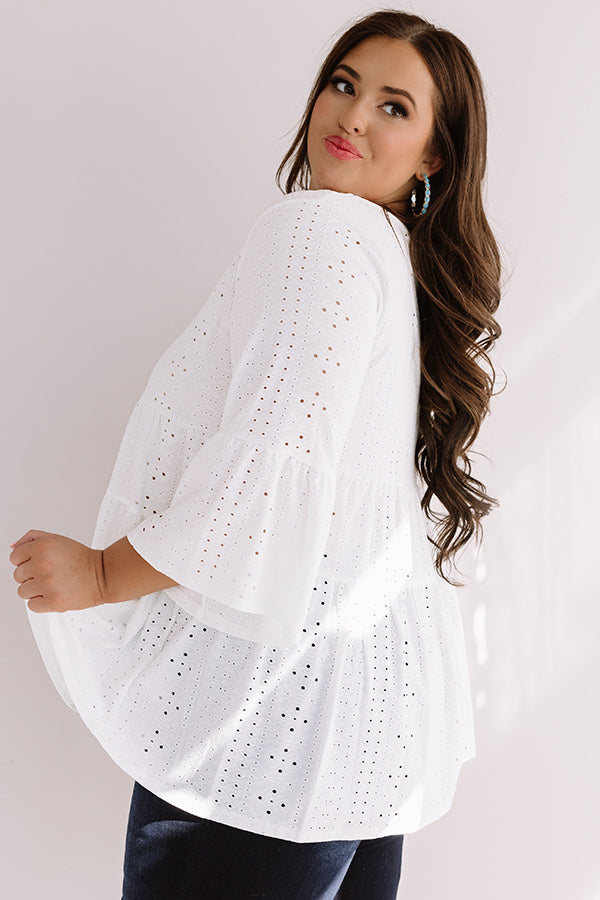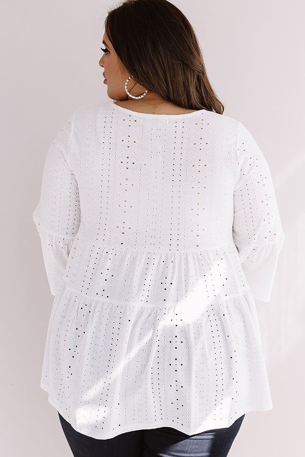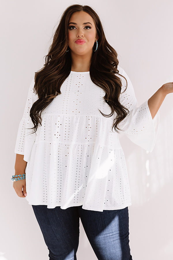Plus Size - Your styling options are endless with our adorable white "Amalfi Mood" shift top featuring lightweight material patterned with eyelet detailing. a high rounded neckline. loose 3/4-length sleeves with flared cuffs. and a relaxed babydoll silhouette that falls into an uneven hemline! We have paired this cutie with some dark wash skinnies. neutral wedges. and an embellished clutch. but you can also wear it with some distressed flares. "The Everly Patent Heel in Blush." and our "Pass The Prosecco Wool Hat in Blush!"
