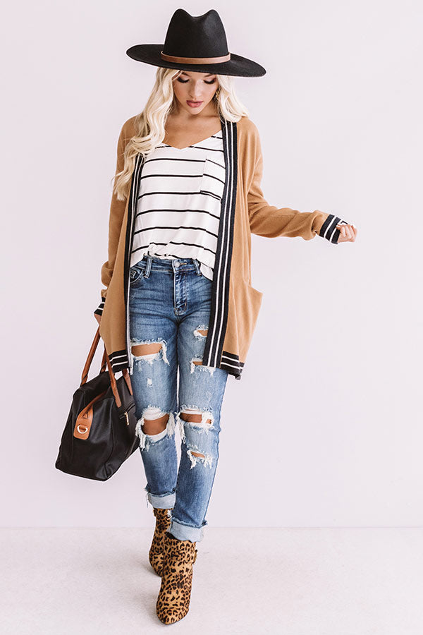 Apple spice and everything nice! Whose ready for the ultimate neutral moment?! Featuring long sleeves. front pockets. and striped lining. this cozy cardigan is a stylish staple we know you're going to be obsessed with! The fit of this cardigan is true to size and the feel is ultra soft. For a fall statement. we love this cardigan layered over our Feeling Fortunate Stripe Shift Tee and paired with our Emmaline Leopard Booties!