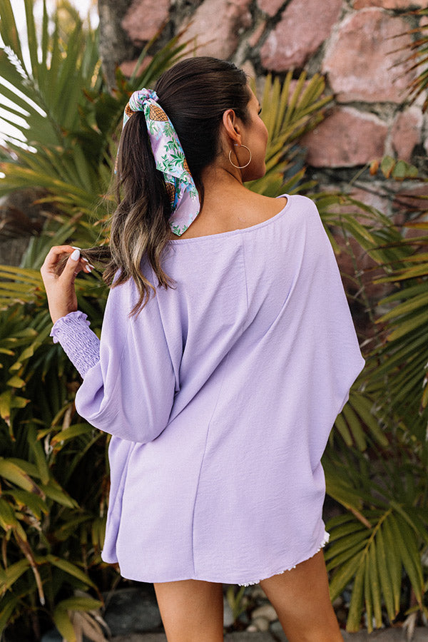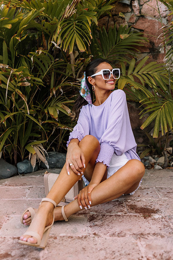 - People are sure to appreciate how adorable this purple hued shift top is! - Lightweight material - Rounded neckline - Loose 3/4-length sleeves with wide smocked cuffs - A relaxed silhouette that falls into a straight hemline